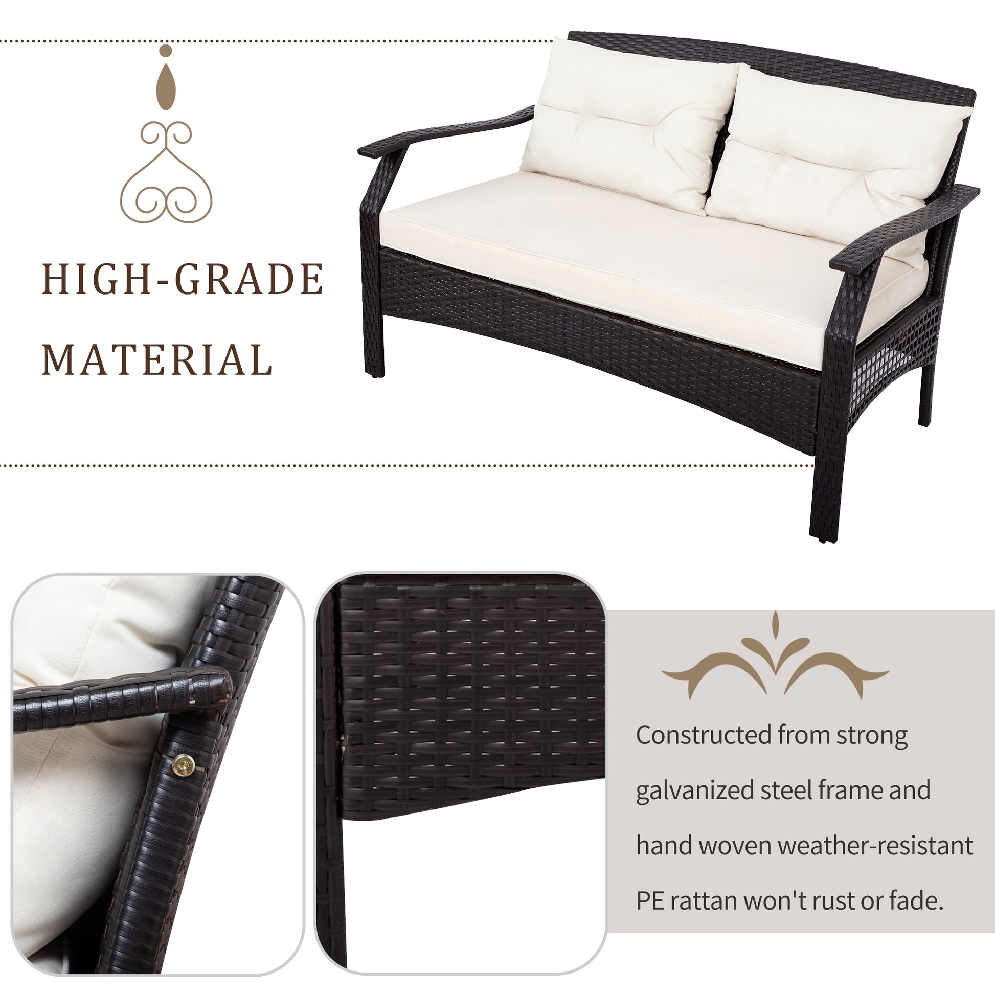 Take an elegant approach when it comes to furnishing your backyard or patio. Complete with 4 pieces, this set can seat a total of 4 people, coming with 2 chairs and a loveseat. Outfitted with soft foam cushions this, patio set offers the perfect blend of comfort and charm, also boasting rich beige cushion upholstery that is easy to spot clean and has been double stitched for maximum durability. The gradient commercial grade rattan has been formulated to be weather proof to prevent untimely cracking, fading, rot and more adding to overall longevity. Enjoy the center coffee table and entertain guests with food and drinks with its shatter resistant tempered glass top.