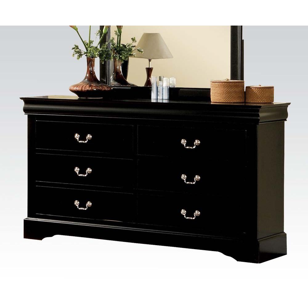 This Louis Philippe III dresser comes in black, cherry, white, and antique gray finish. Features six drawers that provide ample space to store your clothing, bedding and linens. All drawers have brushed nicked metal hardware and center metal glides. This beautiful dresser will be the perfect complement from the most sophisticated to decor casual settings.
