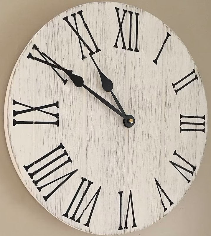 This totally hand made wall clock is a Rustic Wood Wall Clock created to give you the farmhouse appearance in your home. It is created from plywood lumber that is cut into strips, stained, then painted with a dry-brush old white finish. It is then sanded to allow some of the background stain to show through, giving it that farmhouse look that everyone is so crazy about.